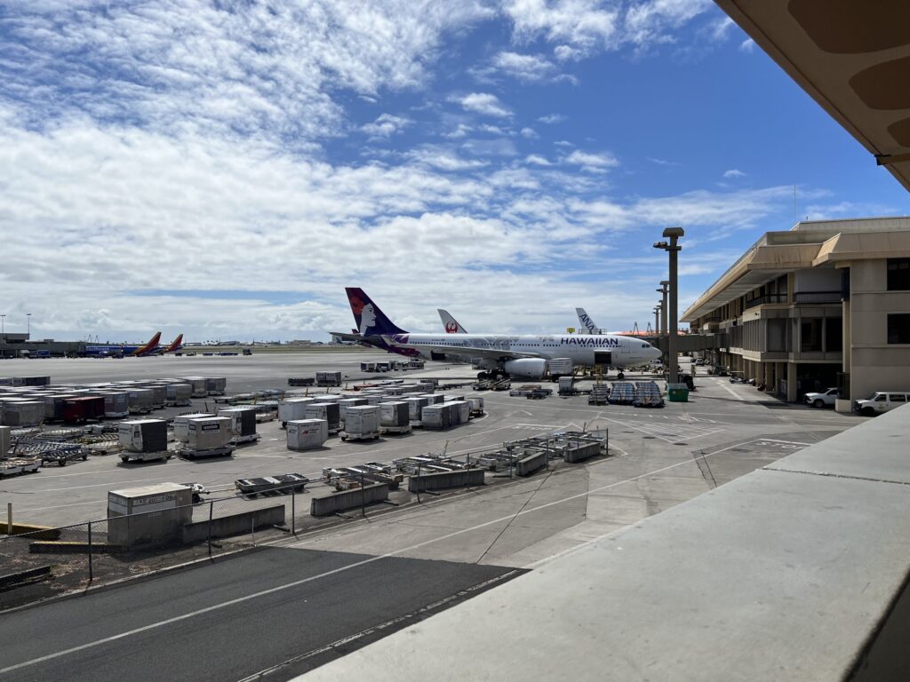 日本(成田・関空など)を夜に出発 →し、ホノルル国際空港(ダニエル・K・イノウエ空港)へ到着するのは朝~昼頃。
